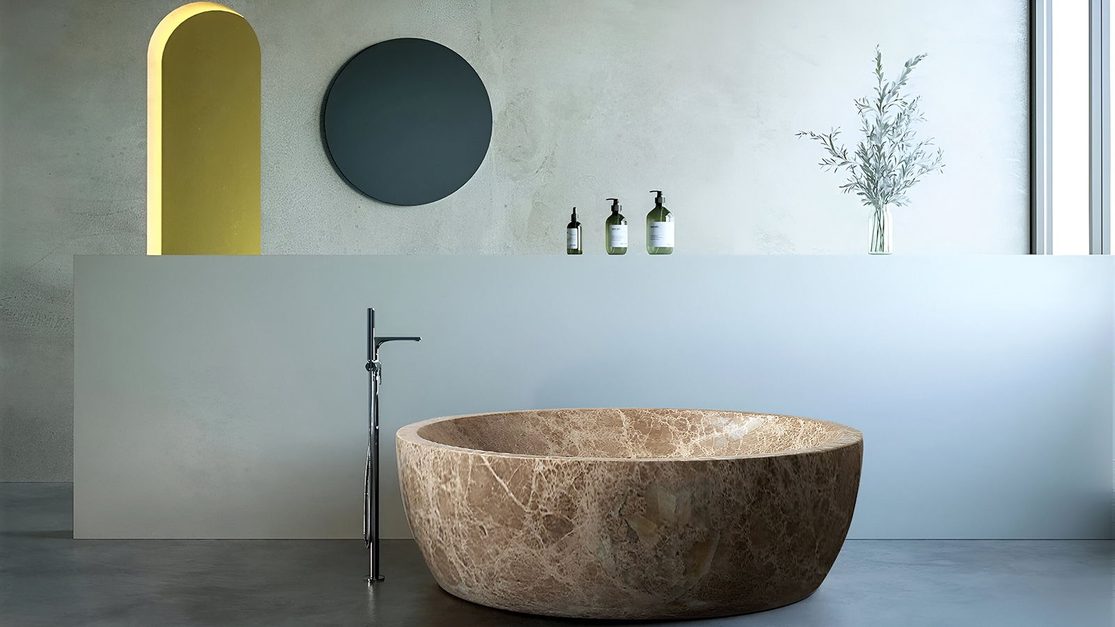 Каменная ванна Bowl Bathtub вырезана из цельного блока натурального камня - мрамора Emperador Light (ИСПАНИЯ) бежевого цвета, c стабильный с прожилками текстурой. Эта мраморная ванна круглой формы с глянцевой фактурой может быть установлена в ванной комнате квартиры или загородного дома. Также вы можете заказать у нас производство такой ванны по индивидуальным размерам, дизайну или из другого материала изготовления. . Для того, чтобы она оптимальным образом вписалась в интерьер места установки как с точки зрения дизайна, так и путем точного соответствия необходимым вам техническим и физическим параметрам изделия. При этом производство под заказ есть смысл планировать только в случае, когда у вас есть запас по времени 90 дней и более с момента согласования всех параметров заказного изделия и подписания Договора Поставки.