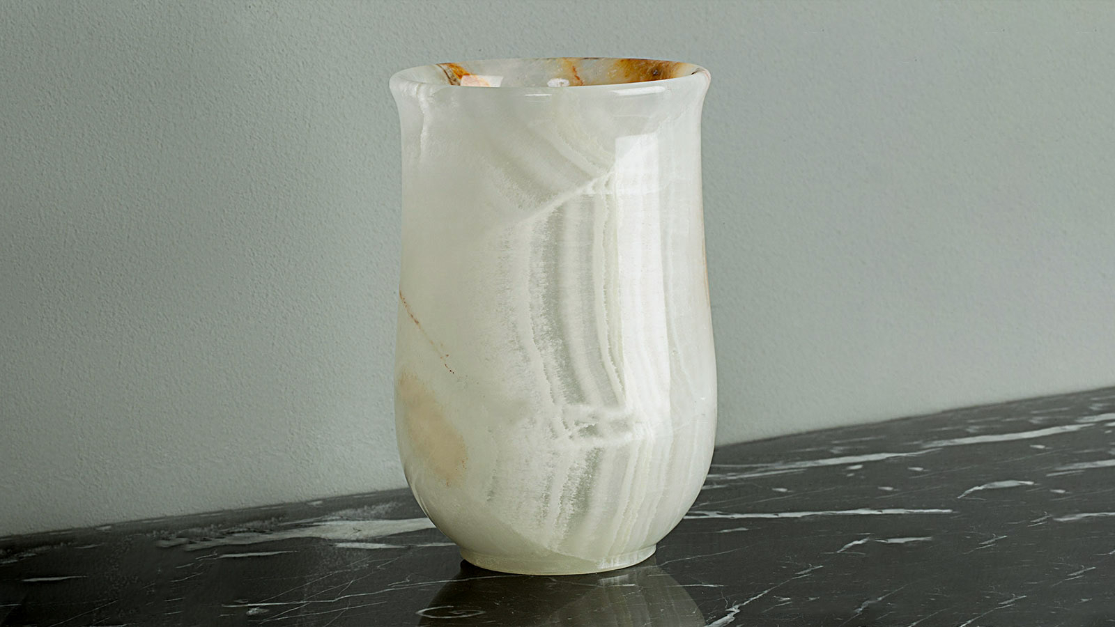 Стакан для зубных щеток в ванную Lira из оникса, формы тюльпана. Произведен из натурального камня белого цвета. Стакан для зубных щёток из оникса - универсальное решение для современной ванной комнаты, способное гармонично вписаться в любой интерьер благодаря своей природной эстетике и благородству. стакан для зубных щеток Lira привносит свою особую атмосферу и характер в пространство. В классическом интерьере такой стакан подчеркнёт статусность и утончённость обстановки, в современном — добавит нотку природной естественности, а в минималистичном — станет выразительным акцентом.Благодаря своей универсальности и красоте, Lira становится не просто функциональным предметом, а настоящим украшением ванной комнаты, которое преображающим повседневные ритуалы ухода за собой.
