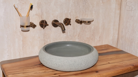 Накладная раковина Ronda вырезана из цельного блока натурального камня андезита Green Andesite (ИНДОНЕЗИЯ) зеленого цвета c стабильный с прожилками текстурой. Эта каменная мойка круглой формы с оплавленной огнем поверхностью может быть установлена как на обычную подставку, тумбу или столешницу в ванной комнате, так и в качестве курны для турецкой бани хамама. Также вы можете заказать у нас производство этой раковины под заказ по индивидуальным размерам, дизайну или из другого материала изготовления. Для того, чтобы она оптимальным образом вписалась в интерьер места установки как с точки зрения дизайна, так и путем точного соответствия необходимым вам техническим и физическим параметрам изделия. При этом производство под заказ есть смысл планировать только в случае, когда у вас есть запас по времени 90 дней и более с момента согласования всех параметров заказного изделия и подписания Договора Поставки.