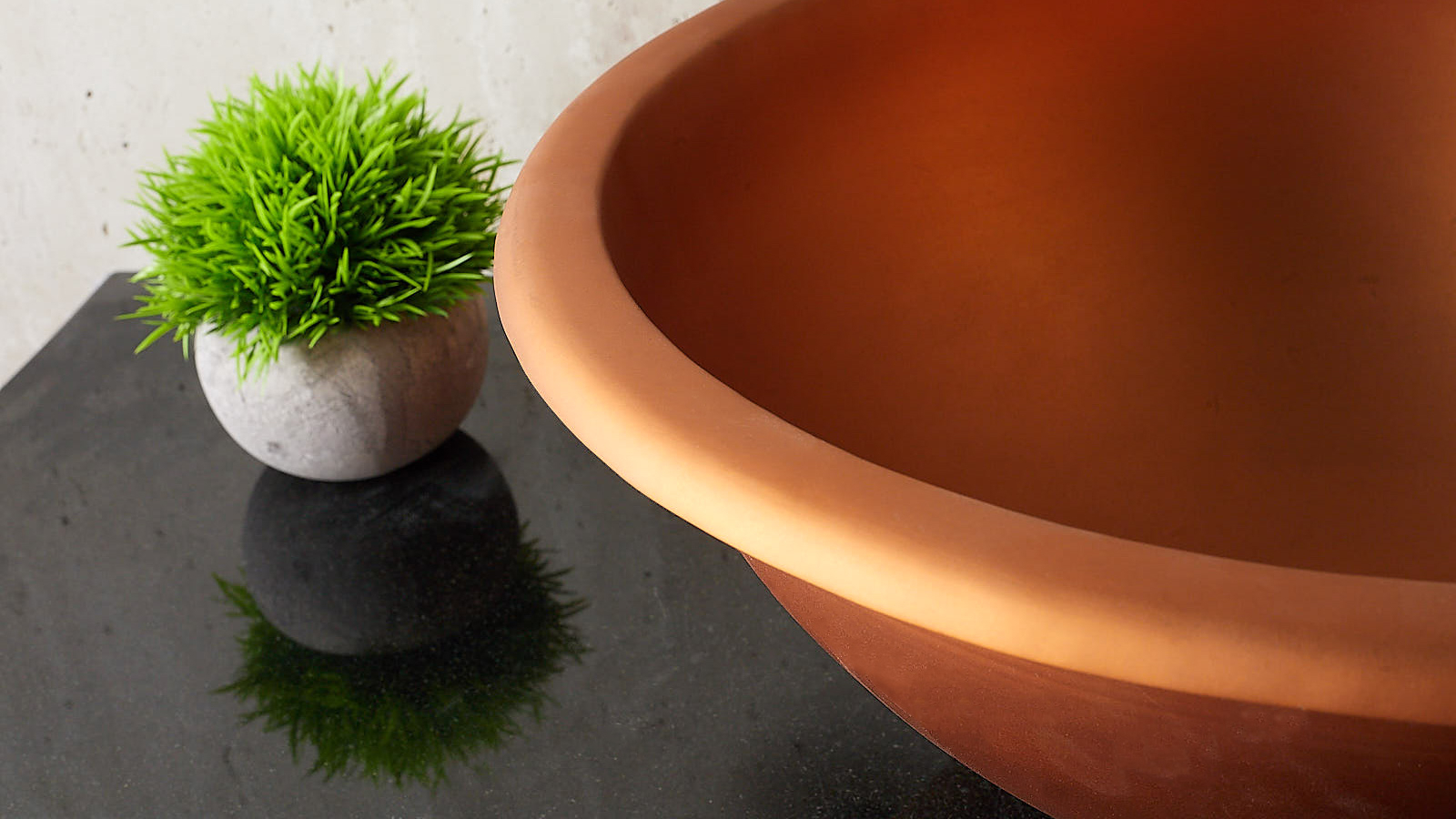 Медная мойка круглой формы Sfera Orange с крашеной фактурой может быть установлена на обычную подставку, тумбу или столешницу в ванной комнате. Эта врезная раковина была произведена из листовой меди Copper (ИНДОНЕЗИЯ) c текстурой. Также вы можете заказать у нас производство такой раковины под заказ по индивидуальным размерам, дизайну или из другого материала изготовления. Для того, чтобы она оптимальным образом вписалась в интерьер места установки как с точки зрения дизайна, так и путем точного соответствия необходимым вам техническим и физическим параметрам изделия. При этом производство под заказ есть смысл планировать только в случае, когда у вас есть запас по времени 90 дней и более с момента согласования всех параметров заказного изделия и подписания Договора Поставки.